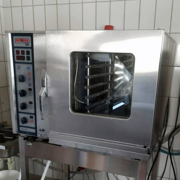 Der Rational CombiMaster CM 61  ist ein professioneller Kombidämpfer für die Gastronomie, der 6 x 1/1 GN-Bleche aufnehmen kann und durch seine Funktionen Dämpfen, Heißluft (30-300°C) und Kombinieren von Dampf und Luft vielseitiges Garen ermöglicht, ideal zum Braten, Garen, Schmoren und Regenerieren, mit Kerntemperaturfühler und Selbstreinigung für Effizienz und Hygiene in der Küche.